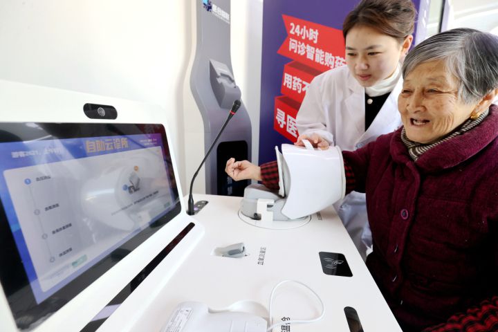 在浙江省湖州市德清县阜溪街道兴山未来社区居家养老服务中心,家庭医生辅助社区老人进行云问诊。图片来源:新华社