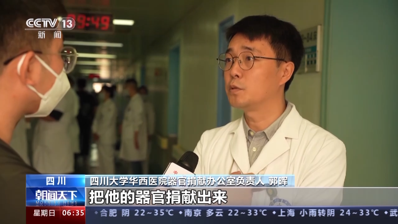 四川大学华西医院器官捐献办公室负责人 郭晖:4月份的时候,当时有一个61 岁的一个男性病人,是一个自发性的脑出血,当时在我们医院救治,已经诊断为脑死亡。在生前他也有提到过,他逝世后把器官捐献出来救人的意愿。最后家属决定在这个病人过世之后把他的器官捐献出来。