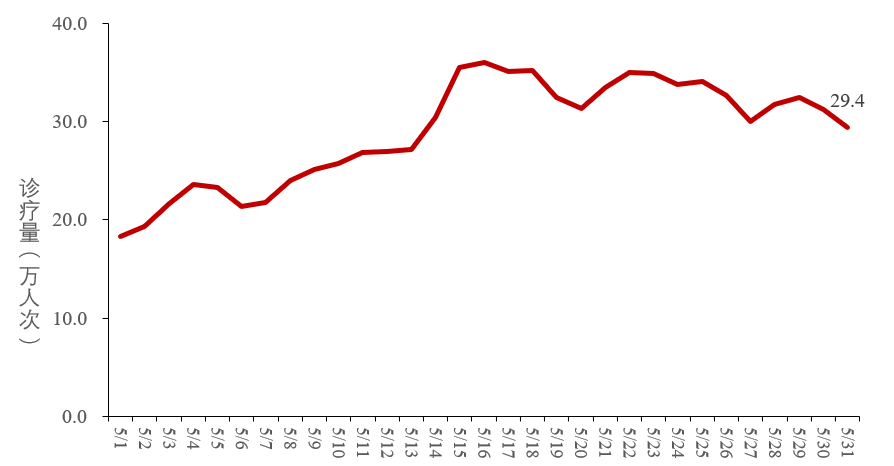 全国31个省(自治区、直辖市)及新疆生产建设兵团发热门诊(诊室)诊疗量从2023年5月1日的18.3万上升至5月16日的36.0万,之后波动下降至5月31日的29.4万。见图2。