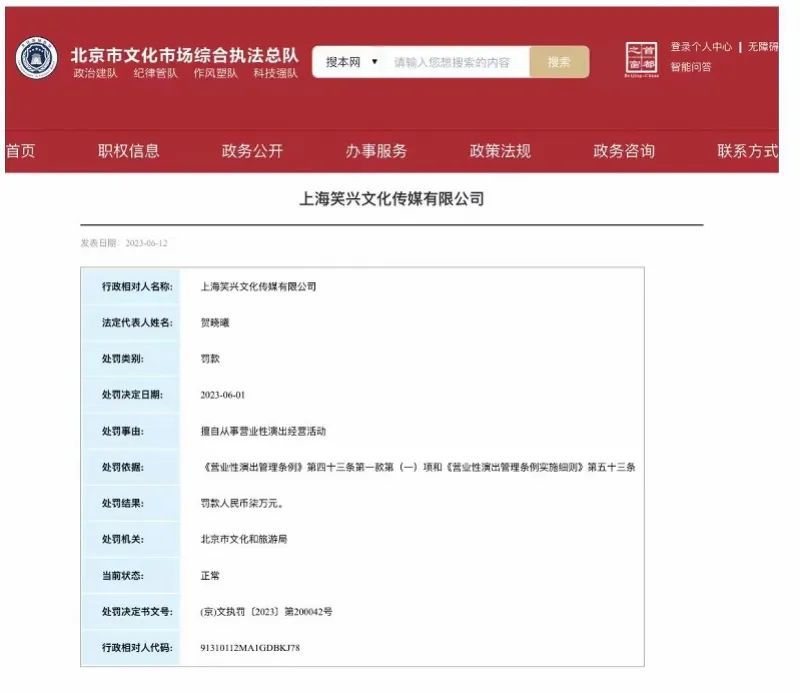 6月13日,记者从北京市文化市场综合执法总队获悉,近日,上海笑兴文化传媒有限公司,因擅自从事营业性演出经营活动,被北京市文化和旅游局罚款7万元。根据国家企业信用信息公示系统显示,上海笑兴文化传媒有限公司成立于2020年7月,法定代表人为贺晓曦,该公司由上海笑果演艺集团有限公司全资持股。6月13日晚,笑果文化方面回应称,此次是关于5月13日同一事件做出的不同公司主体的处罚。“在未接到管理部门许可前,我们绝对不会擅自恢复任何演出。”