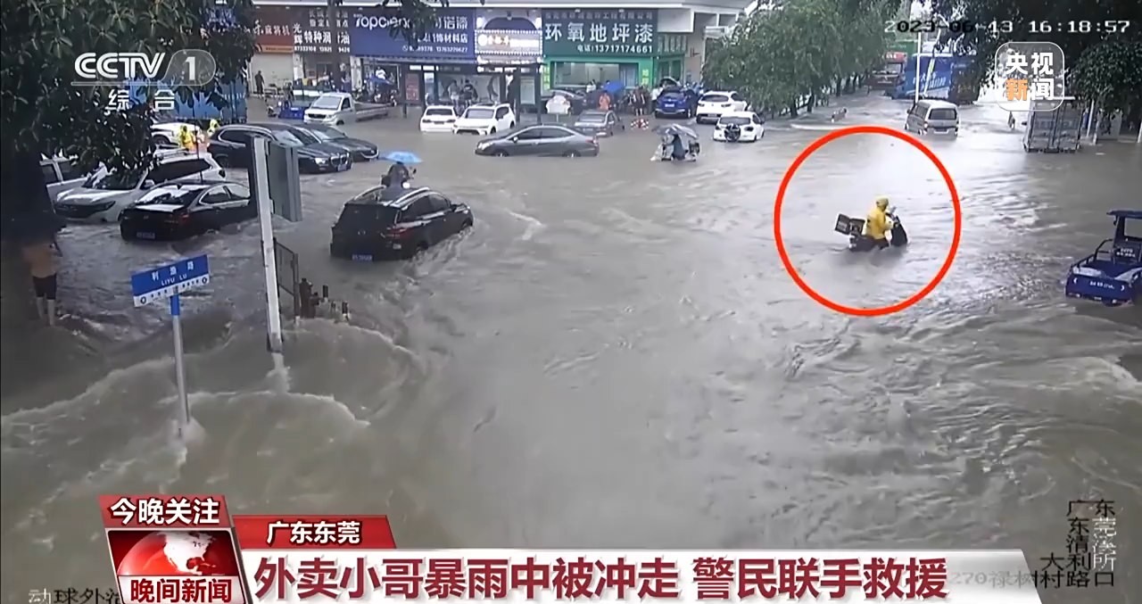 汛期强降雨,不仅会给高速行车带来不便,也会增加路面的安全隐患。民众出行又该如何科学避险呢?这段画面显示,6月13日下午的一场暴雨,造成广东东莞多处街道被水淹没。当天下午,一名外卖骑手为了配送订单,不顾执勤人员阻拦,坚持逆流而上。结果在前行过程中,受到水流的猛烈冲击,骑手失去平衡,连人带车被水一起冲走。在紧急关头,幸亏现场执勤巡警与另一名外卖员及时出手,合力将该名外卖骑手拉住,才避免了悲剧的发生。