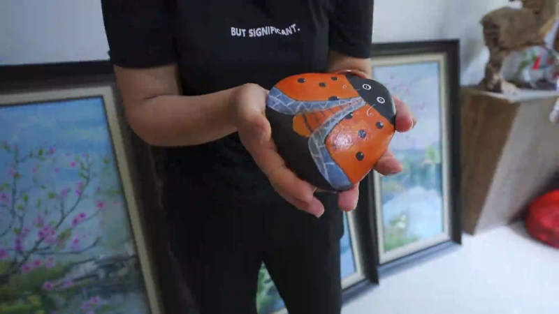 村民雷春英被邻居们叫做“瓢虫姐姐”,河边随手捡拾的鹅卵石,在她的笔下变成了一只只可爱的瓢虫。家里的墙上,也挂满了自己创作的各类作品。
