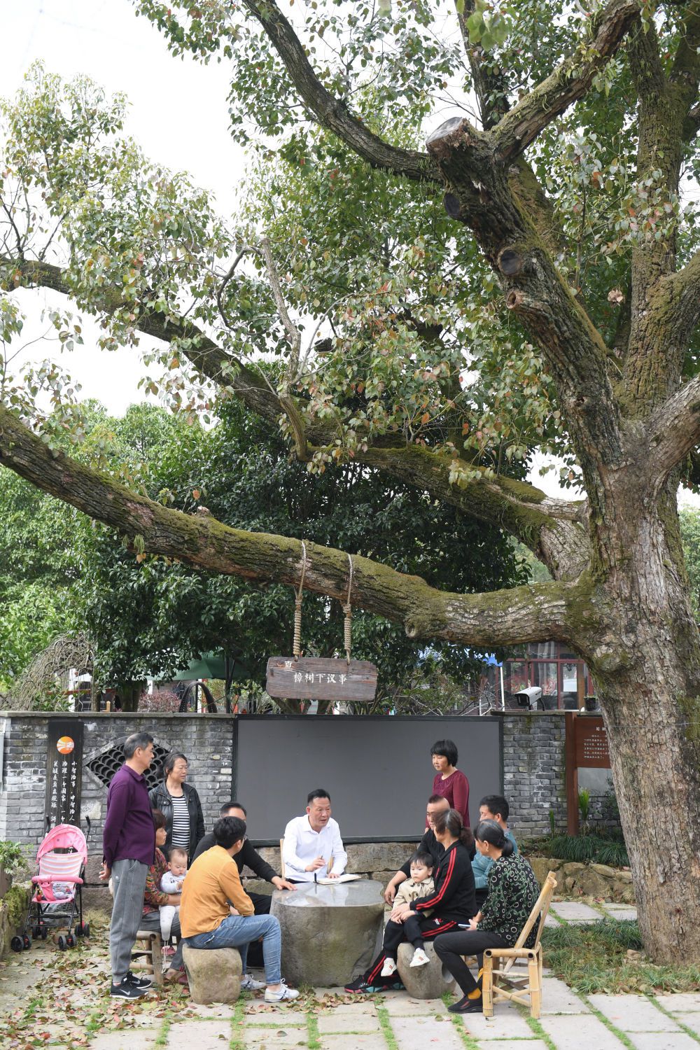 在浙江杭州市余杭区小古城村一株老樟树下,村民在商议乡村发展事项(2022年3月14日摄)。新华社记者 翁忻旸 摄