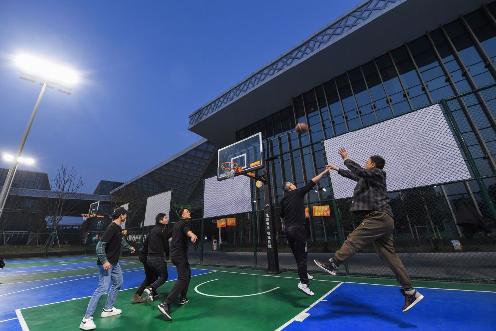 村民们在浙江省湖州市吴兴区织里镇文体中心的灯光球场打篮球(2022年1月18日摄)。新华社记者 徐昱 摄