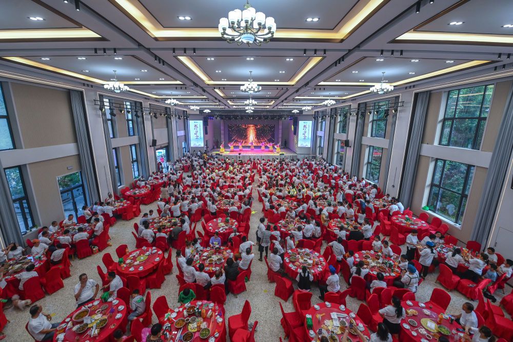 浙江建德市新安江街道梅坪村村民在村文化礼堂内参加百家宴并观看文艺演出(2023年5月27日摄)。新华社记者 徐昱 摄