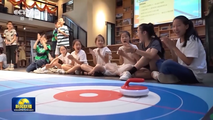 在绍兴竹田头村,偏远村落的孩子们正在新建的农家书屋里体验冰壶课。