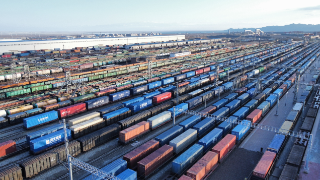 新疆阿拉山口站,中欧班列集结待发。图源:新华社