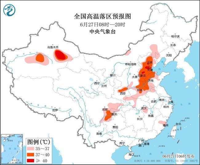 中央气象台6月27日6时继续发布高温黄色预警:预计6月27日白天,华北东部、黄淮、汾渭平原以及新疆、四川盆地等地有35~36℃高温天气,其中,北京、天津、河北大部、山东北部和西部、河南中北部以及陕西关中、四川盆地东南部和中部、云南东北部、新疆东部等地的部分地区最高气温有37~39℃,河北中部、北京东南部、天津西部局地可达40℃以上。