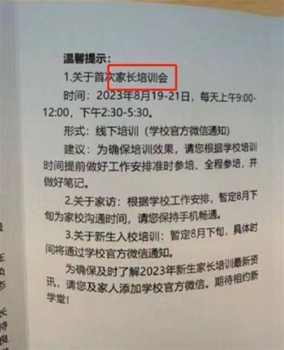 网友发布的通知显示,2023年8月19日-21日举办首次家长培训会,每天上午9点-12点,下午2点30分-5点30分,形式为线下培训。此外,该学校还建议,为确保培训效果,请家长根据学校培训时间提前做好工作安排准时参培、全程参培,并做好笔记。