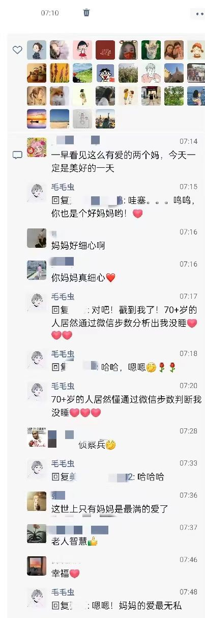 茆女士告诉记者,妈妈已经71岁了,平时不怎么会用智能手机,但是老人家平时一直通过微信步数,来了解自己的生活起居状况。2日深夜,没想到老人家居然会通过微信步数,判断女儿没睡。而且,茆女士说,后来自己才得知,母亲是半夜醒来看到这“158步”的。但知道女儿带着两个孩子睡觉很劳累,所以一直忍到早上7点才问,因为茆女士每天的起床闹钟定的是7点。