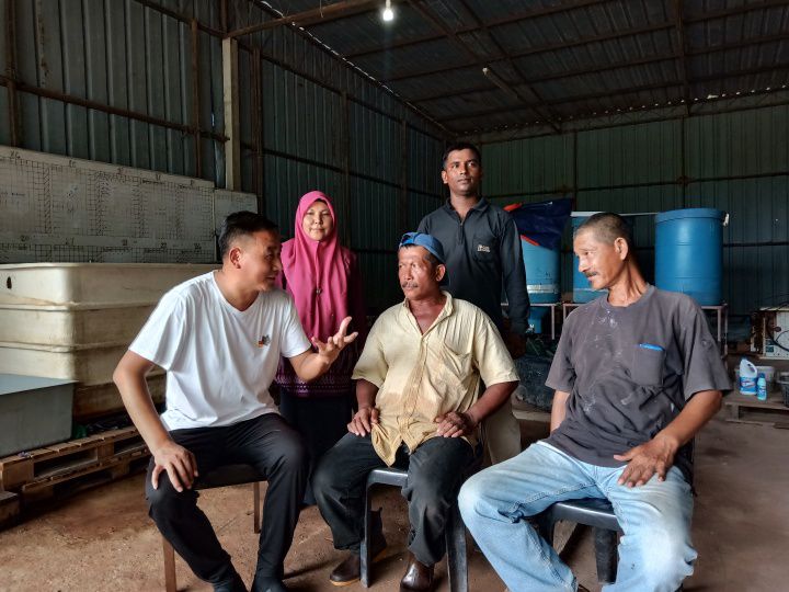 林后宜(左)与马来西亚曼绒县养殖场的员工交流养殖致富经。受访者供图
