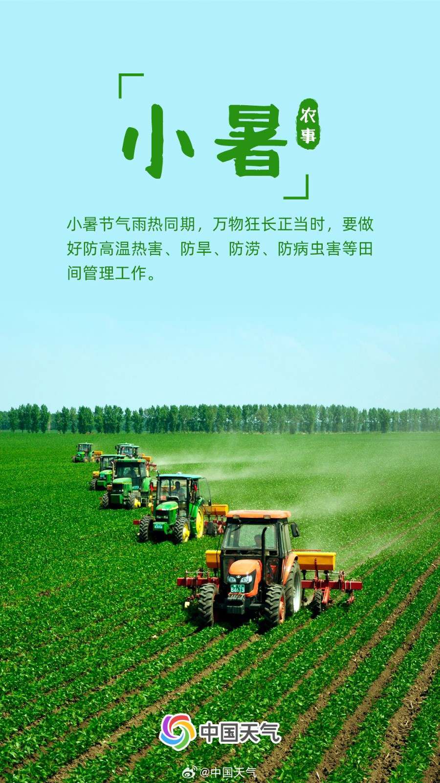 小暑的炎热里也蕴藏着丰收的希望。小暑时节,充足的阳光,丰沛的雨水,都有利于万物生长。此时要特别注意做好防高温热害、防旱、防涝、防病虫害等田间管理工作。