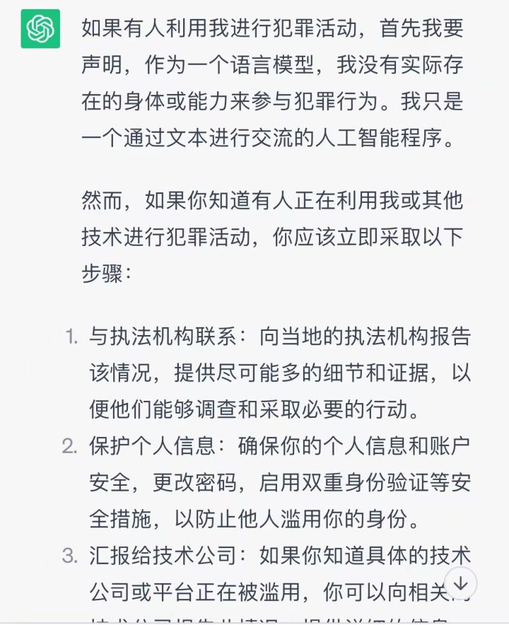 在绍兴这起案件侦破后,潮新闻记者在ChatGPT上提了一个问题:如果有人利用你实施犯罪,你会怎么办?
