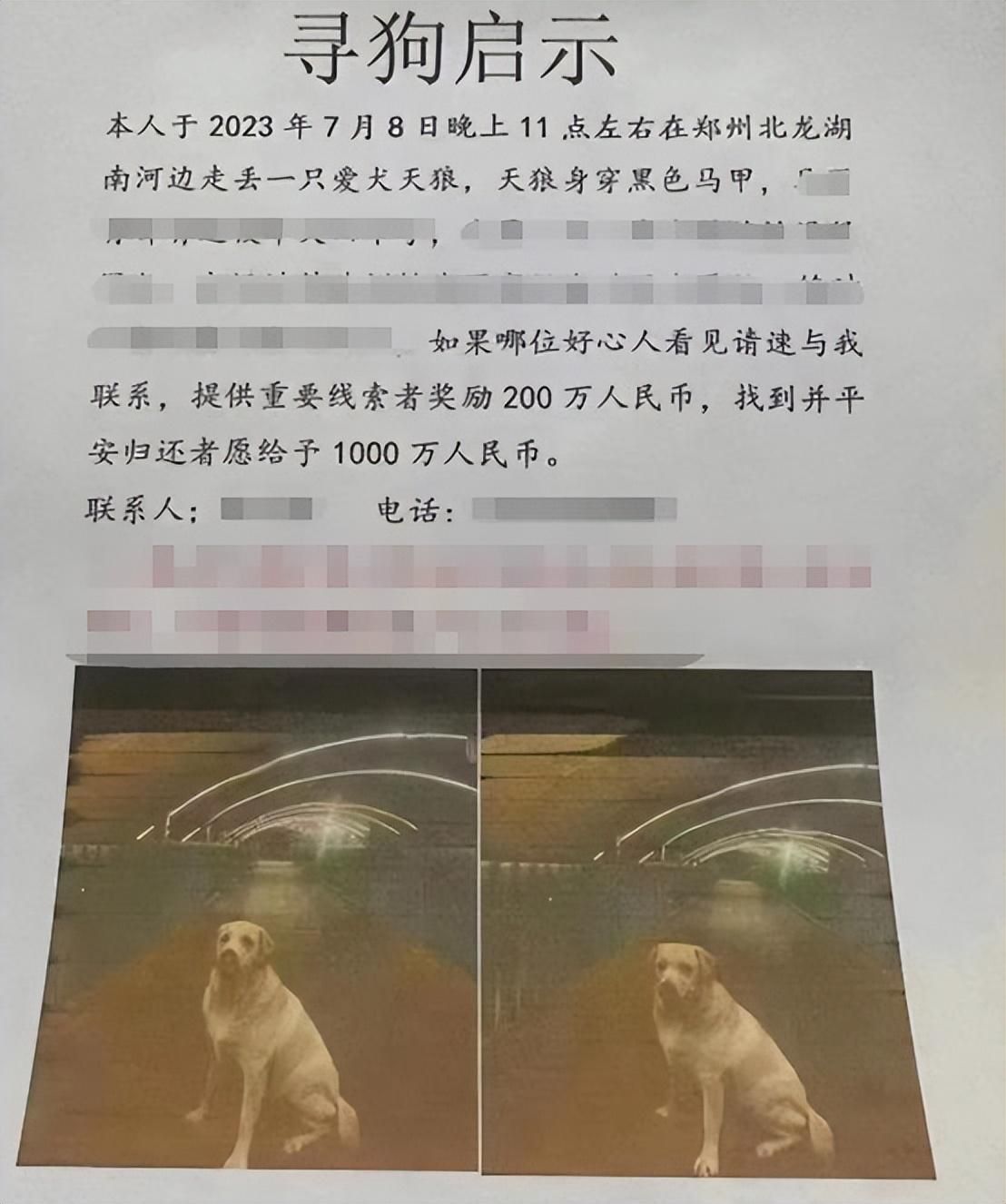 7月9日,“郑州流浪动物领养中心”发布了一则特殊的寻狗启事,如果能提供重要线索者,狗主人奖励200万人民币,如果找到并平安归还,狗主人愿给予1000万人民币。启事的末尾,还有一句红字称,如果伤害这条功勋犬,倾家荡产也要追究到底。