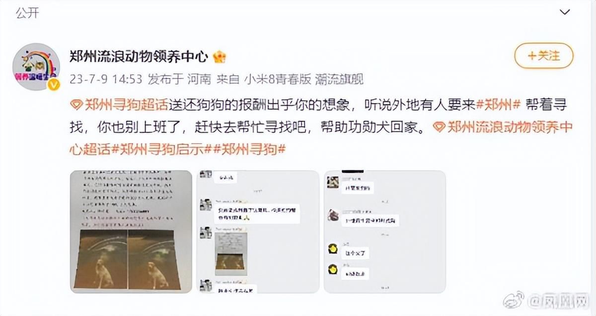" 郑州流浪动物领养中心 " 也配文称:" 送还狗狗的报酬超出你的想象,听说外地游人要来郑州帮着寻找,你也别上班了,赶快去帮忙寻找吧。"