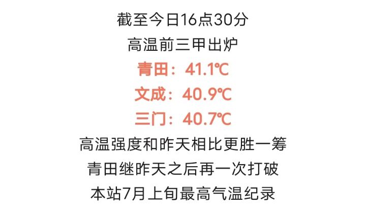 截至16点30分,浙江高温前三甲出炉——青田:41.1℃、文成:40.9℃、三门:40.7℃。