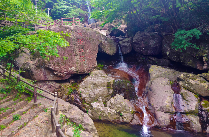潮新闻记者探访龙王山,手扶着两侧的围栏,小心翼翼地拾级而下,蝉鸣与鸟叫不断传入耳中,“黄浦江源”四个大字赫然出现在眼前。