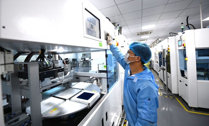 在杭州市富阳区春江街道富春湾新城的杭州正银电子材料有限公司的研发实验室内,自动化设备在进行光伏板的丝网印刷(3月22日摄)。新华社发