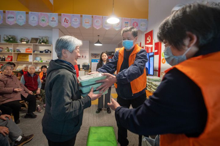 杭州市上城区南星街道白塔岭社区志愿者在社区服务驿站为老人发放免费爱心午餐(2022年11月23日摄)。新华社发