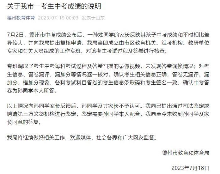 据山东省德州市教育和体育局微信公众号消息,德州市教育和体育局19日发布说明,7月2日,德州市中考成绩公布后,一孙姓同学的家长反映其孩子中考成绩和平时相比差异较大,并提出复核申请,德州市教育和体育局当即成立由市区教育机关、组考机构、教研单位专家和有关人员组成的工作专班,对该考生考试过程及答卷进行核查。