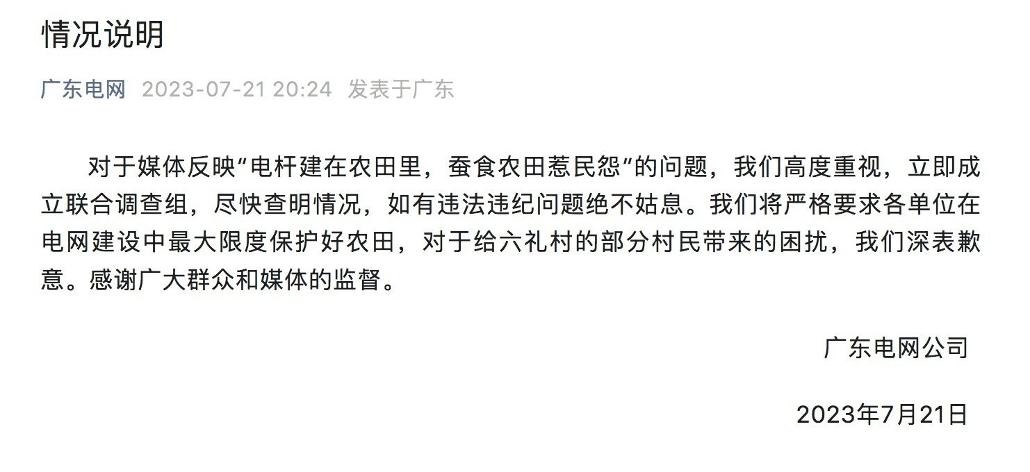 针对媒体反映的“电杆建在农田里,蚕食农田惹民怨”相关问题,广东电网公司7月21日晚发布情况说明,称对此“高度重视,立即成立联合调查组,尽快查明情况,如有违法违纪问题绝不姑息。”