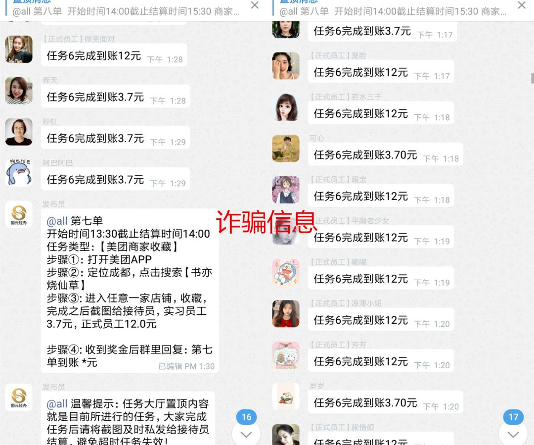 诈骗分子会在群内发放刷单任务,完成即可领取红包,给人带来一些甜头。等你彻底放下防备心后,便引诱你下载软件、充值垫付,完成佣金更高的兼职任务。