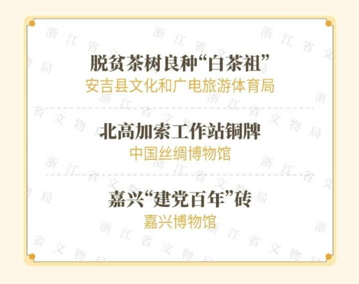 其中,脱贫茶树良种“白茶祖”、北高加索工作站铜牌、嘉兴“建党百年”砖等三件来自浙江的物品榜上有名。