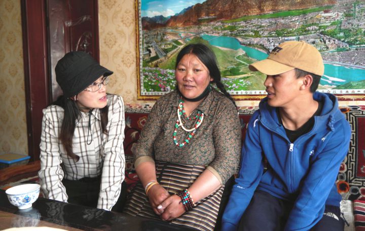 浙江援藏老师戴海萍(左一)在藏族学生家中做家访。 拍友 岳新东 摄