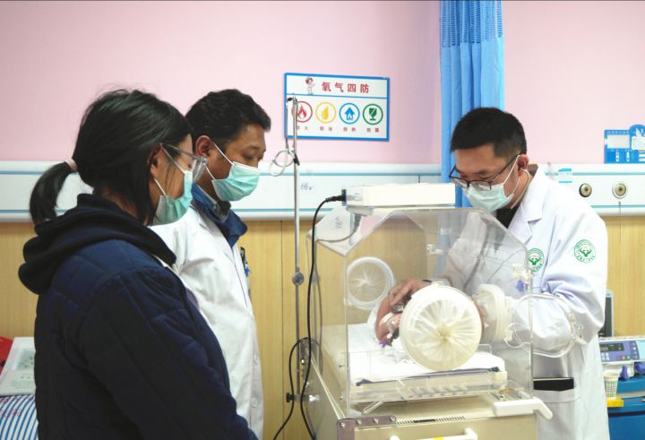 浙江援藏医生黄锂新(右一)在比如县人民医院检查新生儿情况。 拍友 岳新东 摄