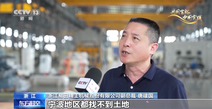 浙江易田精工机械股份有限公司副总裁 唐建国:宁波地区都找不到土地,而且租用厂房也找不到。我们对厂房的要求也很高,我们层高是27米,行车是150吨的。因为产能要扩大,订单在增加,很着急。