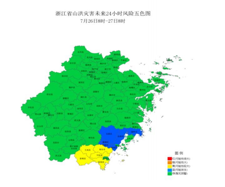 浙江省水利厅、省气象局今日9时联合发布山洪灾害预警:根据省气象台未来降雨预报, 预计7月26日8时至27日8时,平阳县、苍南县、文成县、泰顺县、瑞安市发生山洪灾害可能性较大(黄色预警),鹿城区、龙湾区、瓯海区、永嘉县、乐清市、温岭市可能发生山洪灾害(蓝色预警)。