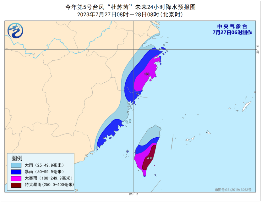 降水预报:27日08时至28日08时,台湾岛、福建东部、浙江东部等地有大到暴雨,其中,台湾岛东部、浙江东部沿海等地的部分地区有大暴雨,台湾岛东南部局地有特大暴雨(250~400毫米)。