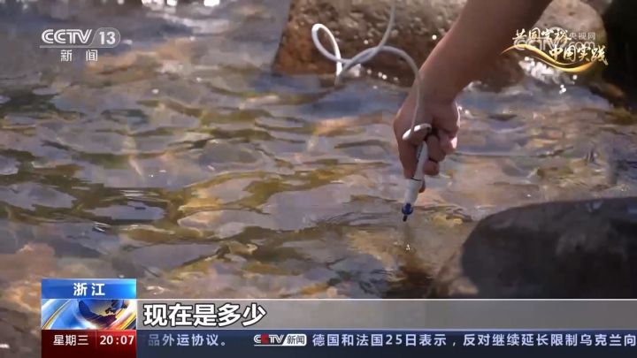 工作人员正在检测溪水水质,为GEP中“水质净化”指标采集数据。
