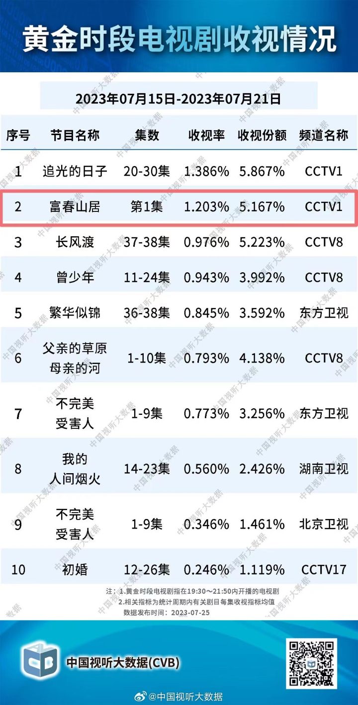 这段时间,浙产电视剧《富春山居》正在央视一套热播。据中国视听大数据显示,7月15日至21日,该剧收视率为1.203%。