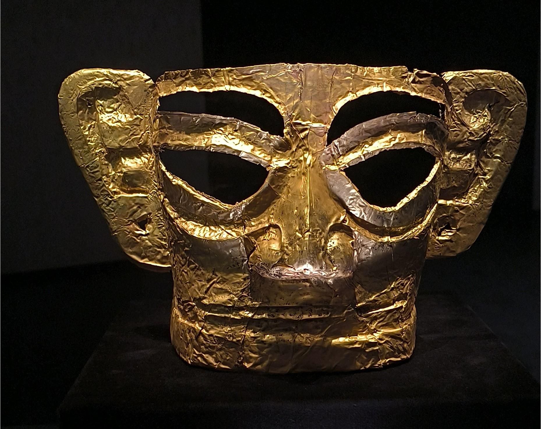△三星堆博物馆展出的金面罩。(总台央视记者范凯拍摄)