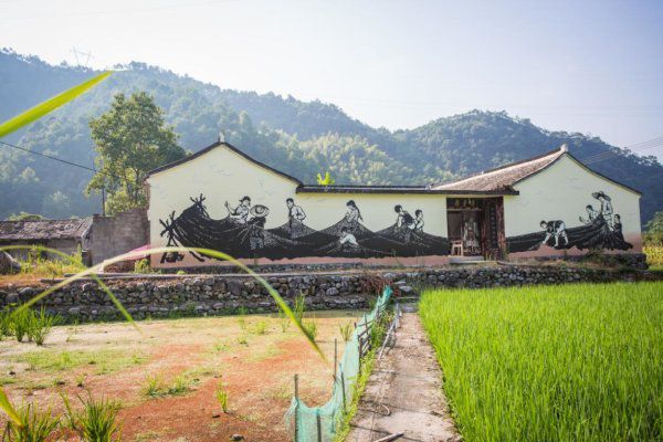 最近一次他来村里,绕着村子走,又觉得可以增添不少细节,弥补之前的缺憾:这面墙没画到屋顶,最上方空了一大块三角形,要补上;那边的画前面怎么堆了一堆东西,拍照不好看;还有,这个宁溪镇白鹭湾村白鹤岭下文化礼堂里,得增加点版画村的元素……