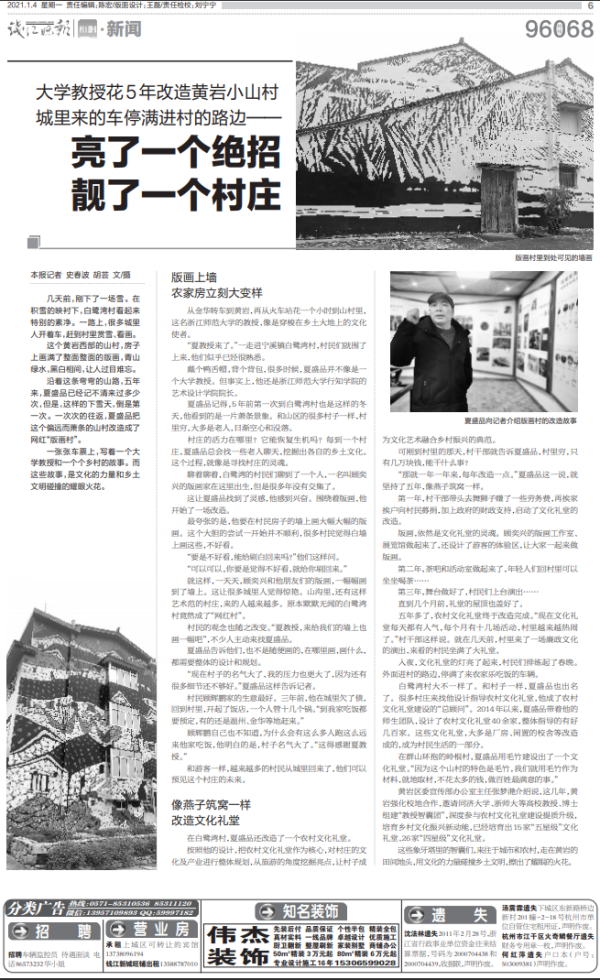 老夏如今是浙江师范大学行知学院设计艺术学院的院长,但他和白鹭湾的联系是从2016年开始的,和当地合作,想思路、做规划、找人手,把出生于村里的版画家顾奕兴以及友人们的众多作品,搬到村舍高高矮矮的外墙上。