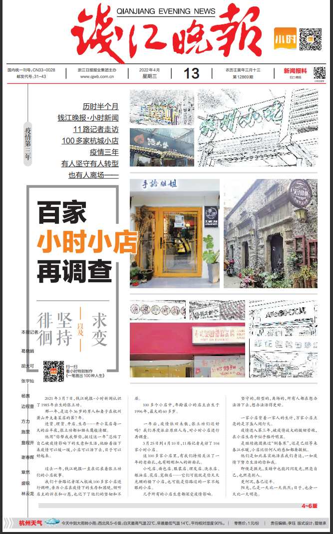 从2021年春天开始,钱江晚报一直持续关注杭城小店的生存状况。从最初的《社区小店生存启示录》“看见”小店,到《百家小店生存调查报告》为小店数据画像,再到拿出最硬核的版面资源,发出“帮帮小店”的鼓与呼……3年来,数百家小店进入钱江晚报的视野,成了我们的“老朋友”。