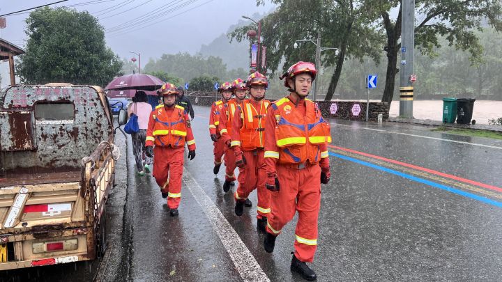 7月27日,平阳县因受台风影响雨量增强造成部分地区发生内涝积水和地质灾害事故,消防救援人员冒雨对沿途进行排查。