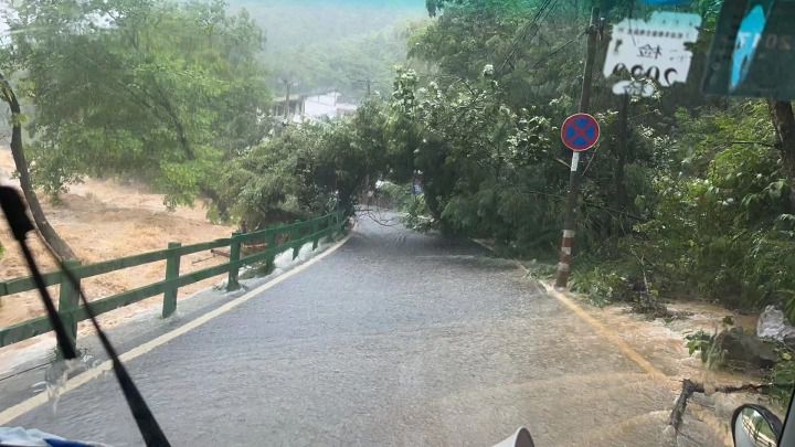 救援途中,一处山路由于雨水冲刷,导致树木倒在了路上,影响人员疏散和救援车辆的出入,消防救援人员将倒在道路中央的树木进行清理。