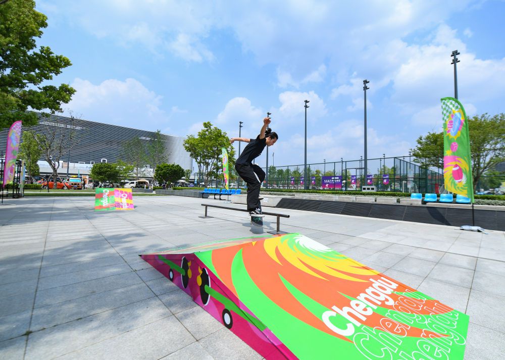 滑板爱好者在成都东安湖体育公园练习滑板。