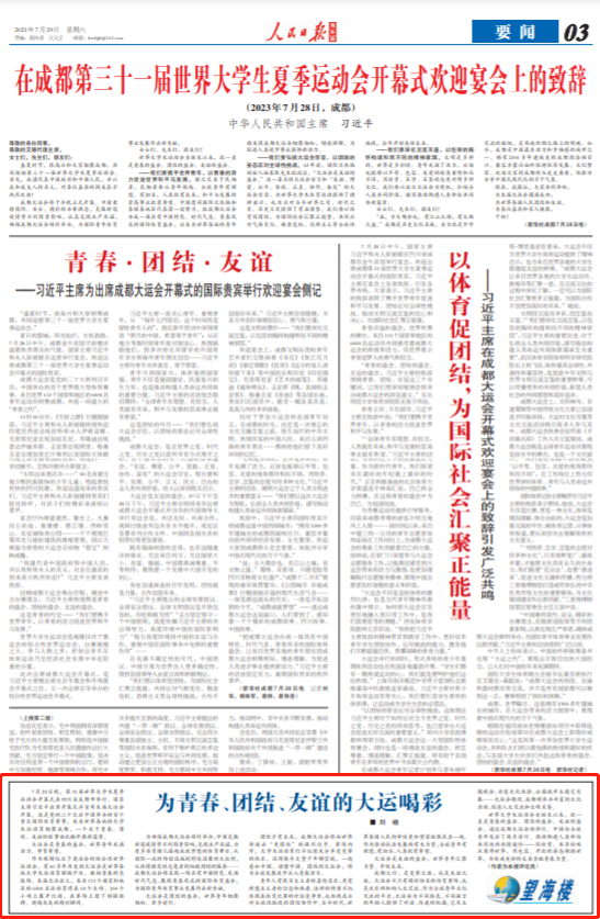 世界大学生运动会自诞生以来,就一直是青春的盛会、团结的盛会、友谊的盛会。通过成都大运会的举行,中国向全球青年发出了携手前行、推动构建人类命运共同体的热情邀约——用欣赏、共享的观点看待世界,用包容、开放的姿态拥抱世界,为创造美好的未来贡献青春力量。