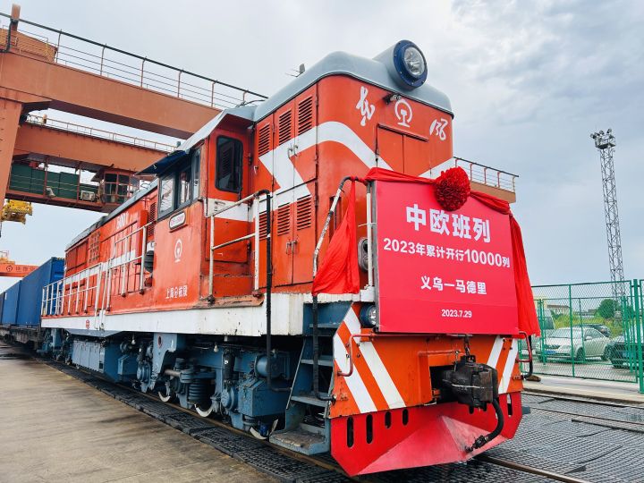 7月29日上午10时18分许,随着中欧班列(义乌—马德里)从义乌西站开出,今年我国中欧班列累计开行达10000列,较去年提前22天破万列,累计发送货物108.3万标箱,同比增长27%。