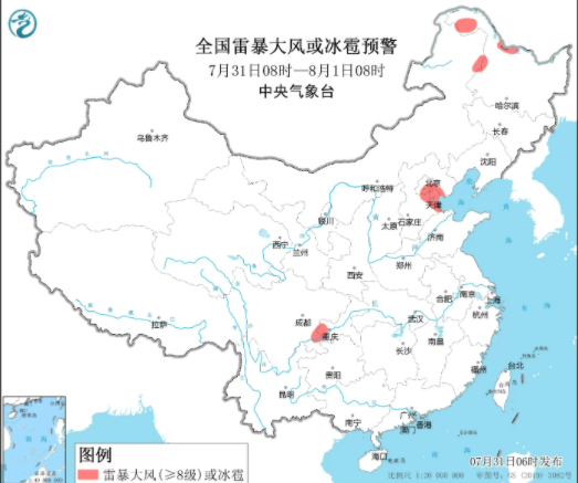 中央气象台7月31日6时继续发布强对流天气黄色预警:预计7月31日8时至8月1日8时,黑龙江西北部、河北中部、北京东南部、天津、四川东南部、重庆西部等地的部分地区将有8~10级雷暴大风或冰雹天气;内蒙古中西部、陕西中南部、山西中东部、河北、北京、天津、山东西部、河南、安徽中北部、上海、湖北中西部、湖南西部和南部、江西中北部、浙江东北部和南部、福建、四川北部和东南部、重庆西部、贵州北部、云南中南部、广西东部和西南部、广东中部和西南部沿海、海南岛东北部、台湾岛中南部等地的部分地区将有短时强降水天气,小时雨量30~50毫米,局地可达60毫米以上。预计,强对流的主要影响时段为白天至夜间。