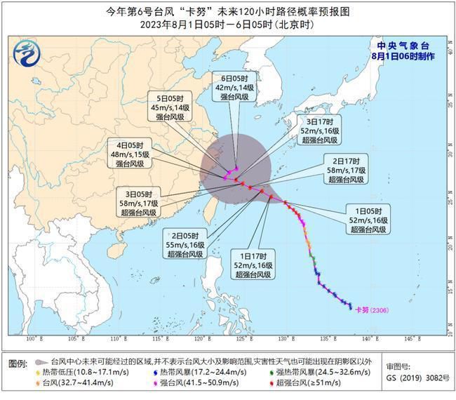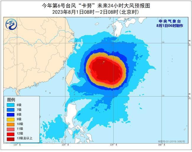 大风预报:8月1日08时至2日08时,东海大部及钓鱼岛附近海域、台湾以东洋面、巴士海峡以及浙江东部沿海、台湾岛北部沿海将有6-8级、阵风9-10级的大风,其中东海东南部海域风力可达9-12级、阵风11-14级,“卡努”中心经过的附近海面的风力有13-16级、阵风17级及以上。