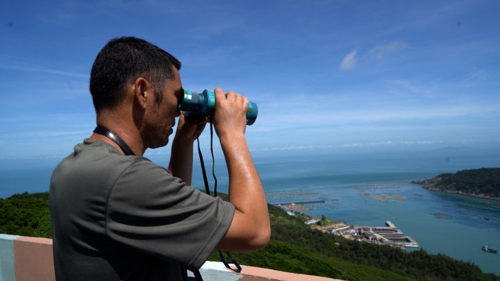哨所建在海岛200多米的荒屿山顶上。以前爬着山石小路前往哨所,两旁是比人还高的芦苇丛,温从针习惯带一根木棍上山,“在我们这里,蛇和老鼠都是我们的‘邻居’,必须要带一根棍子‘打草惊蛇’。”