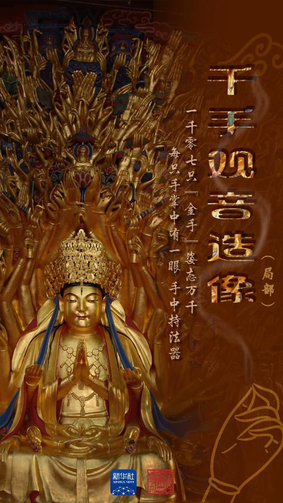 走近看,这座造像头顶和两侧,孔雀开屏般放射状地浮雕着1007只“金手”。造像手中的法器展现了古代人民的生活用具、劳动工具以及战争武器,有着重要的历史价值。