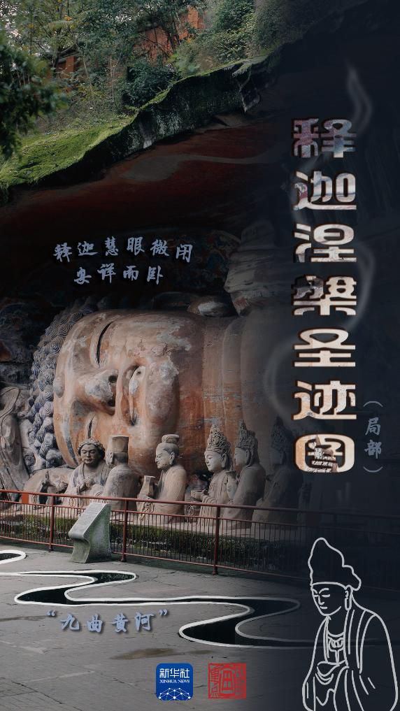 释迦涅槃圣迹图龛高7米、宽32米、深5米,刻像37尊。释迦慧眼微闭,安详而卧。佛像双脚隐入岩际,右肩陷于地下,以有限的画面表现了无限的艺术形象。