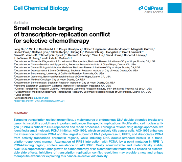 其次还在于该款药物的研究机理比较新。有媒体引用了论文作者之一、“希望之城”分子诊断和实验治疗学系教授琳达·马尔卡斯(Linda Malkas)的介绍,她认为之前大多数癌症靶向治疗都集中在单一途径上,会令癌细胞发生突变,并最终产生抗药性。而AOH1996针对的是一种名为增殖细胞核抗原(PCNA)的癌变变体,它对DNA复制和肿瘤扩大修复至关重要。