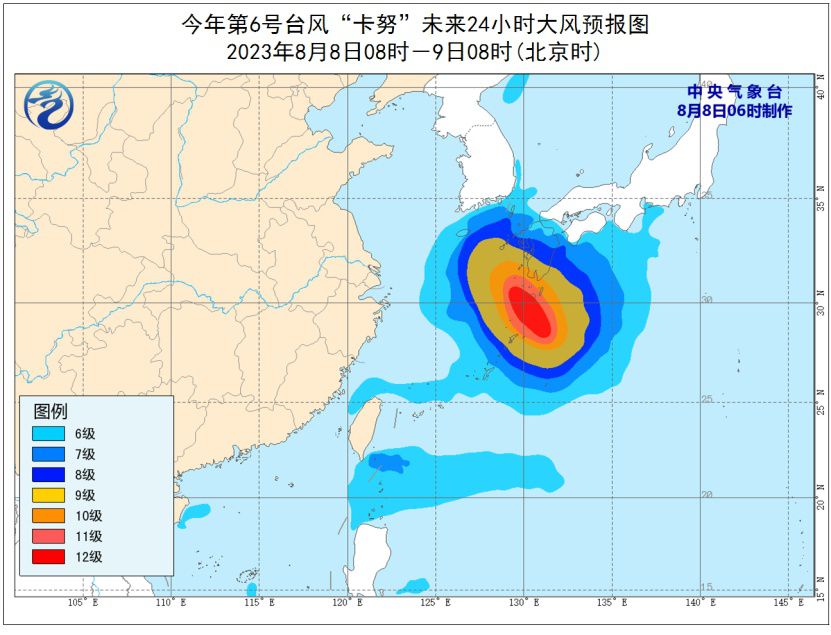 大风预报:8月8日08时至9日08时,巴士海峡、台湾海峡北部、台湾以东洋面、东海南部和东部及钓鱼岛附近海域将有6-7级、阵风8-9级的大风,其中东海东部部分海域风力可达8-10级,阵风11-12级,“卡努”中心经过的附近海域风力可达11-12级,阵风13-14级。